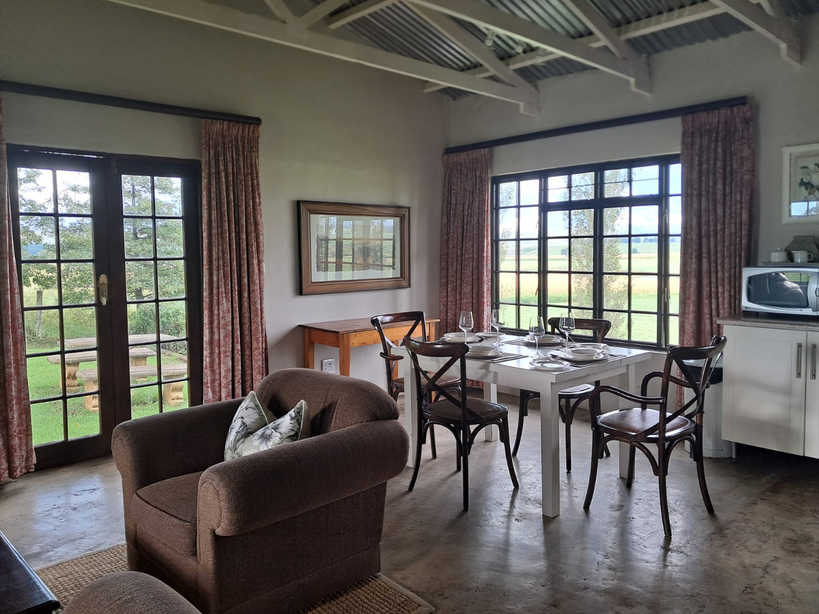 Outside a braai area faces north, with 270 degree views, including the famous Sani Pass and Loteni mountains of the southern Drakensberg. Usually covered in snow from around April annually. Great place to also sit and watch the sometimes spectacular sunsets. The surrounding fields often play host to huge flocks of the endangered Grey Crown Cranes, that can be seen walking the fields, feeding and dancing too. Their unique gently calls are often heard in the early mornings and late afternoons.